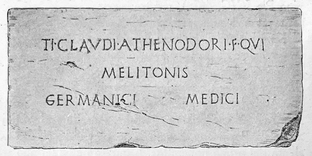 “Some passages of a Greek epigram, which, with a brush dipped in black, had been written on the white plaster of the external wall of the semicircle, near the middle of its curve. The point where these verses could be read is about two-thirds of the height of the wall; so high that, in the present state of the excavation, one would have to get up on a ladder; but when the building was in its original condition, that is to say, sunken the ground up to more than half its height, it was possible to write comfortably in that spot, standing in front of the wall. The part of the plaster on which the epigram had been written, although torn into pieces and lacunose, was detached, by the care of this Commission, and is preserved among its collections of antiquities.”2