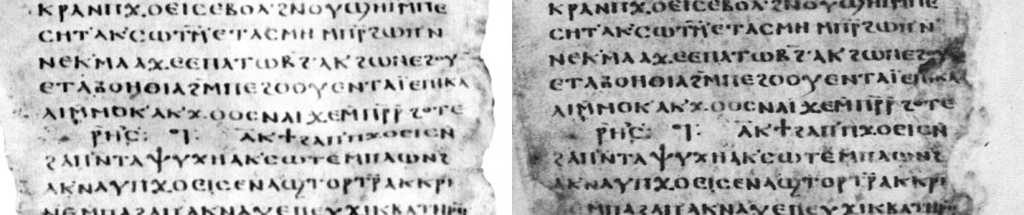 Mississippi Coptic Codex II in 1964 (left) and after “restoration” (right); image sources Kasser, Papyrus Bodmer XXII et Mississippi Coptic Codex II, plate and Kraus, Cimelia, 127.