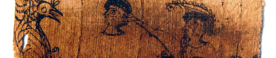 Mythological drawing (possibly Perseus with Medusa’s head) from the Barcelona-Montserrat Greek-Latin codex, P.Monts.Roca inv. 154a; image source: Sofía Torallas Tovar and Klaas A. Worp, To the Origins of Greek Stenography: P.Monts.Roca I (Publicacions de l’Abadia de Montserrat, 2006), plate XXVIII