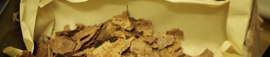What look like the best preserved pieces were removed from these tin boxes, flattened, placed between leaves of the Oxford University Gazette, and stored in a new series of boxes. These can also be seen in screen grabs from another video: