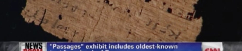 Screen capture from CNN showing a papyrus fragment of Romans in the Green Collection; image source: CNN, “Hobby Lobby president’s rare collection.”