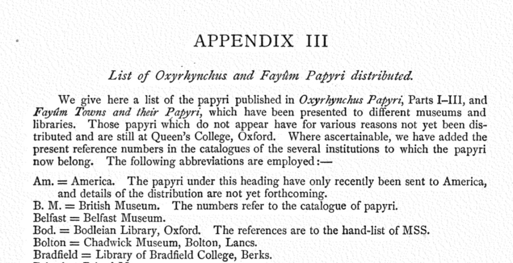 Let me first summarize an earlier post on the topic. Starting in the early days of the excavations of Grenfell and Hunt, the Egypt Exploration Society (then known as the Egypt Exploration Fund) had a regular practice of “distributing” excavated artifacts to donors. Pieces usually ended up at libraries, museums, or schools in the UK and the US. With respect to the Oxyrhynchus papyri, this practice only involved pieces that were already published, and it took place from about 1900 to 1924.  In the Appendix to Volume 4 of The Oxyrhynchus Papyri (published in 1904), the editors gave a list of the papyri that had been donated up to that time and prefaced it with the following note: