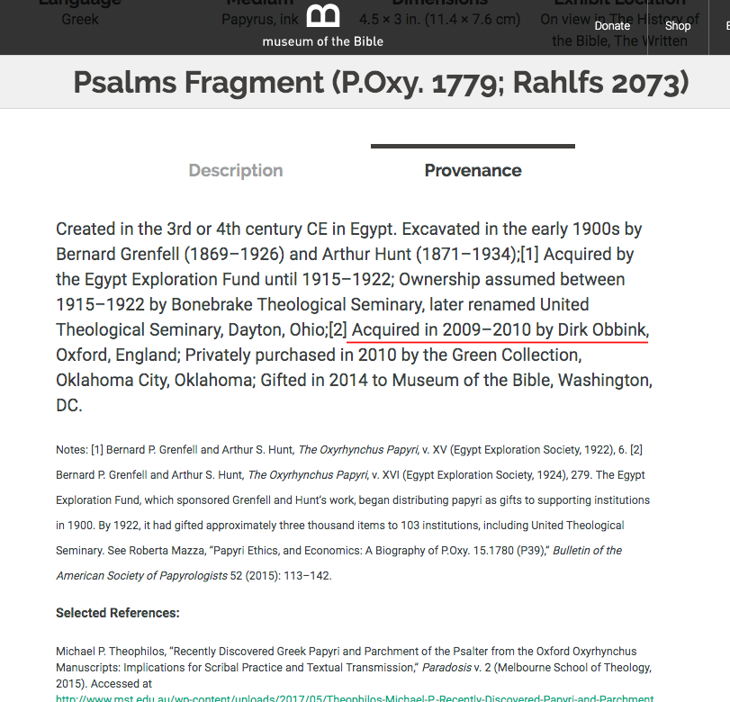 “Provenance” information for P.Oxy. 1779 at the Museum of the Bible website