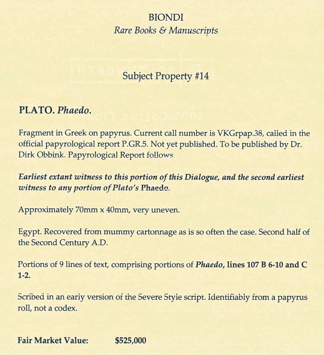 The documents that “incorrectly ascribed information to Dr. D. Obbink, which was incorrect” turn out to be of considerable interest in puzzling out the possible source of at least one of the manuscripts that Scott Carroll has been displaying in his lectures in the last couple years. In a recent remark on an earlier post on that topic, a commenter pointed out that these documents can in fact still be consulted online. This link points to an appraisal, dated June of 2013, for a fragment of papyrus containing Plato’s Phaedo: