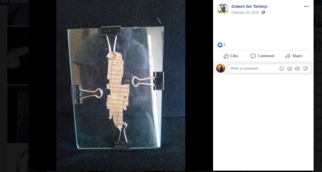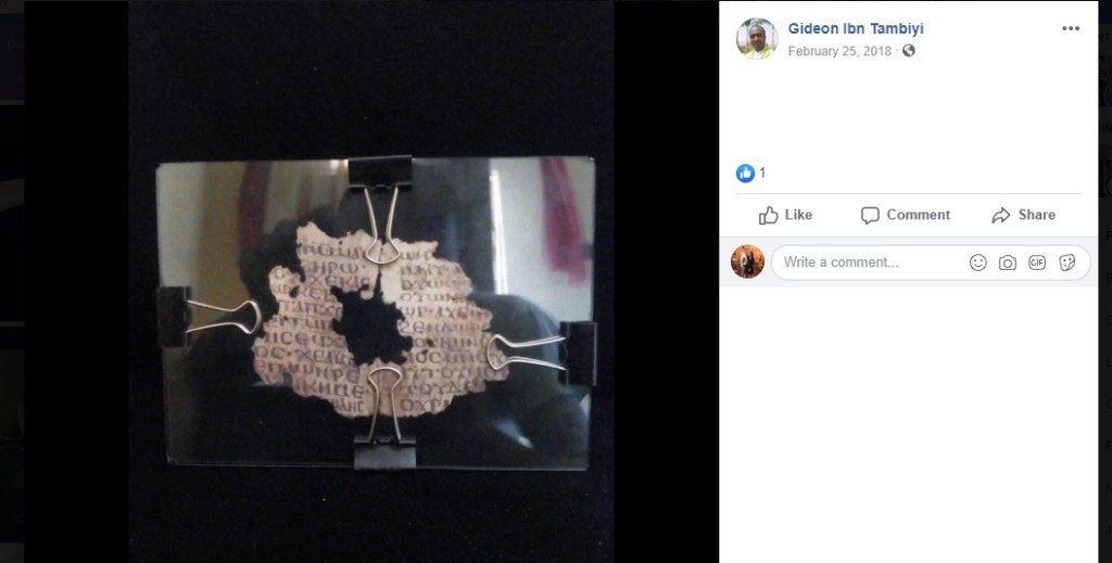 For what it’s worth, it just struck me this morning that Carroll had this papyrus fragment with him at the University of Jos (Nigeria) in 2013. I have a screenshot if you would like to add it to your records. It appears that Carroll was providing some texts to students to study along with the help of Prof. Danny McCain.