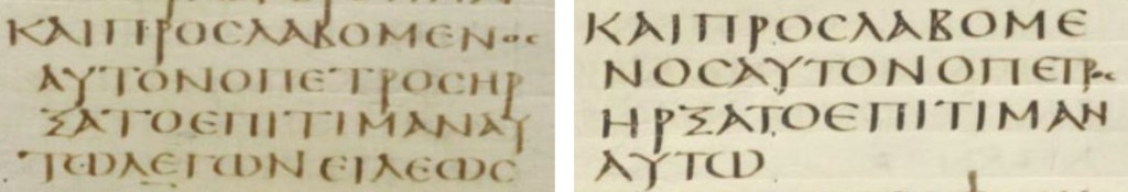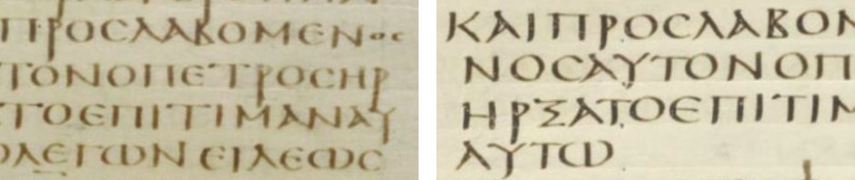 Samples of writing from Codex Sinaiticus: Copyist D, Matt. 16:22 (left) and Copyist A, Mark 8:32 (right); image source: codexsinaiticus.org