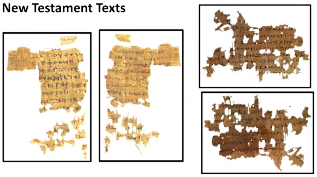 Slide from a talk by Scott Carroll showing fragments of a papyrus of 1 Corinthians; portion shown on the left was in the Green Collection (PAP.000120), portion on the right was not; image source: “Stones and Scriptures”