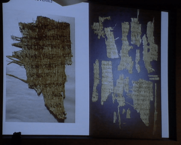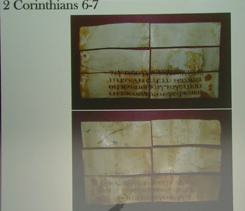 Also, recall Matthew 6 that Jerry Pattengale pulls out of his coat pocket during one of the OKC Passages Lecture Series in 2011. This fragment was also displayed at Verbum Domini in 2012. There’s a decent picture of it in Carroll’s 2016 Strategic Perspective presentation (Session 7, min. 34:48).