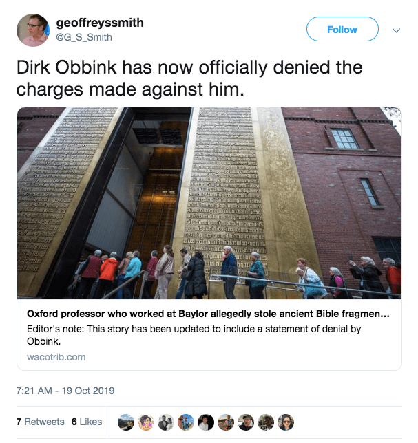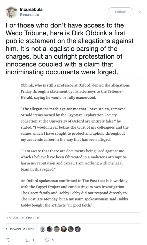 Professor Dirk Obbink has issued a public statement emphatically denying the accusations that he sold Oxyrhynchus papyri to Hobby Lobby. The local Texas newspaper to which Prof. Obbink chose to communicate his statement (the Waco Tribune-Herald) is not available online in Europe: