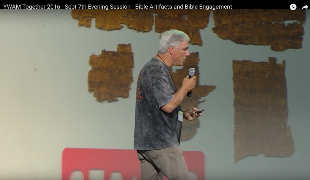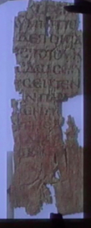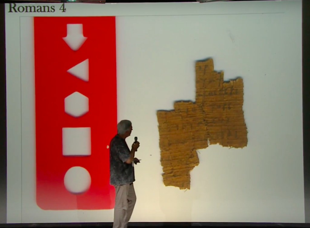 The papyrus is never fully visible in this video, but it certainly seems to me to be the same piece (although Carroll calls it Aesop’s Fables in this video). But the second image is of the reverse side of the papyrus, so it looks like this piece is a codex. Also, notice that there is a red plastic ruler in the photo. This distinctive red ruler also appears in the image of a papyrus fragment that Carroll sometimes identifies as the Gospel of John and sometimes (as here) as Romans: