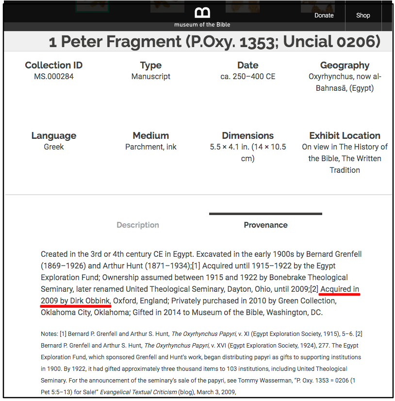 The whole statement (especially the joke about “budgetary strategies”) is breath-taking given the current accusations of theft against Prof. Obbink. But even if those accusations are false, the opinions expressed here sit pretty awkwardly with his involvement in the legal sales of distribution papyri to the Green Family in 2010. Here is the Museum of the Bible’s record for one of nine such items: