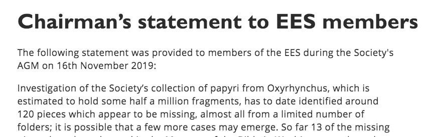 I missed this news from a couple days ago. The Egypt Exploration Society has announced that they are missing at least 120 papyri from the Oxyrhynchus collection.