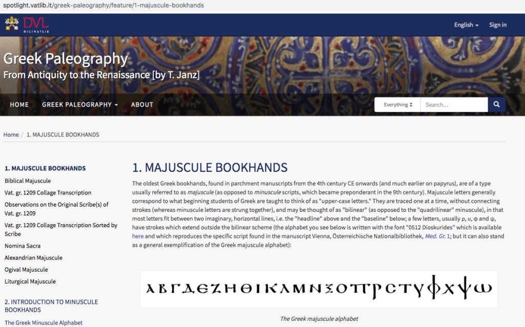 Thanks to Gregg Schwendner for drawing my attention to the Vatican Library website on Greek palaeography prepared by Timothy Janz, scriptor graecus and director of the printed books department of the Vatican Library. The site has an excellent discussion of the history and practice of Greek palaeography and is, as you might expect, very well illustrated.