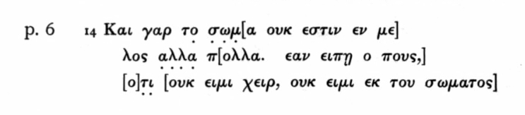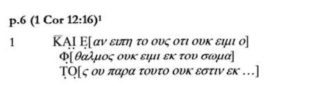 In terms of the transcription, the new edition of Soderquist and Wayment is more conservative than that of Sanders, who, as he phrased it “tried to determine the position of the MS regarding many [variants] which fall in lines partly lost” (Sanders, New Testament Manuscripts, p. 259) Soderquist and Wayment stick to what they can see in the images and thus supply considerably less conjectural text than Sanders. At the same time, they provide a fuller (and obviously more up to date) apparatus for the text. In some instances, however, Soderquist and Wayment offer quite different readings from those presented by Sanders. An extreme example is the page labelled 6. Here is the reading of Sanders, who takes the remains as part of 1 Cor. 12:14: