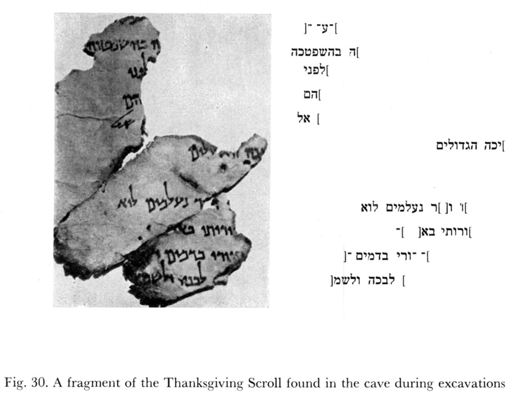 “65. Even the two fragments of the Thanksgiving Scroll do not contain sufficient text to make a conclusive paleographic analysis of the connection between them and larger parts of the scroll. One must also allow for the possibility that the same scribe could have written parts of two scrolls which ended up in two different caves. On the other hand, as Sukenik points out, two scribes wrote the scroll. The second scribe began on line 22 of column 11. (See Sukenik, The Dead Sea Scrolls of the Hebrew University, pp. 18, 38-40 and figures 29 and 30)”
