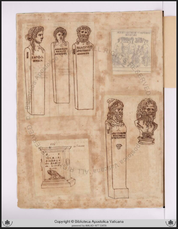 So from this note, it would appear that “l’effigie di Sappho Eresia” was among those pieces that Ligorio sourced to decorate the Cortile del Belvedere at the Vatican (1564-1565) when he was papal architect under Popes Paul IV and Pius IV. These sculptures decorated the area only briefly, before they were given to the people of Rome (that is, sent to the Capitoline and other locations) in 1566 by Pope Pius V, who was less of a fan of pagan statuary.