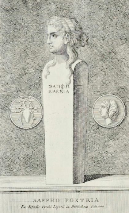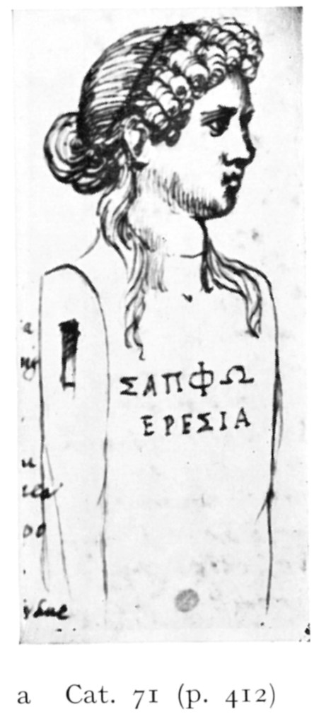 “A herm inscribed Σαπφω Ερεσια is illustrated in Bellori, Imag. 63, and in Gronov, Thes. 11, 34, but has now disappeared. She wears a headdress consisting of a sakkos bound twice round her head, and thick shoulder supports. Apparently not ancient.”