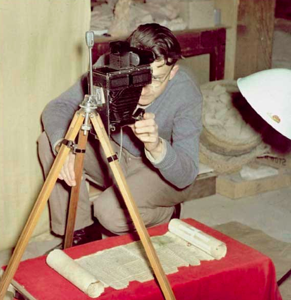 John Trever photographing Dead Sea Scrolls in Jerusalem, 1948; image source: Biblical Archaeology Society