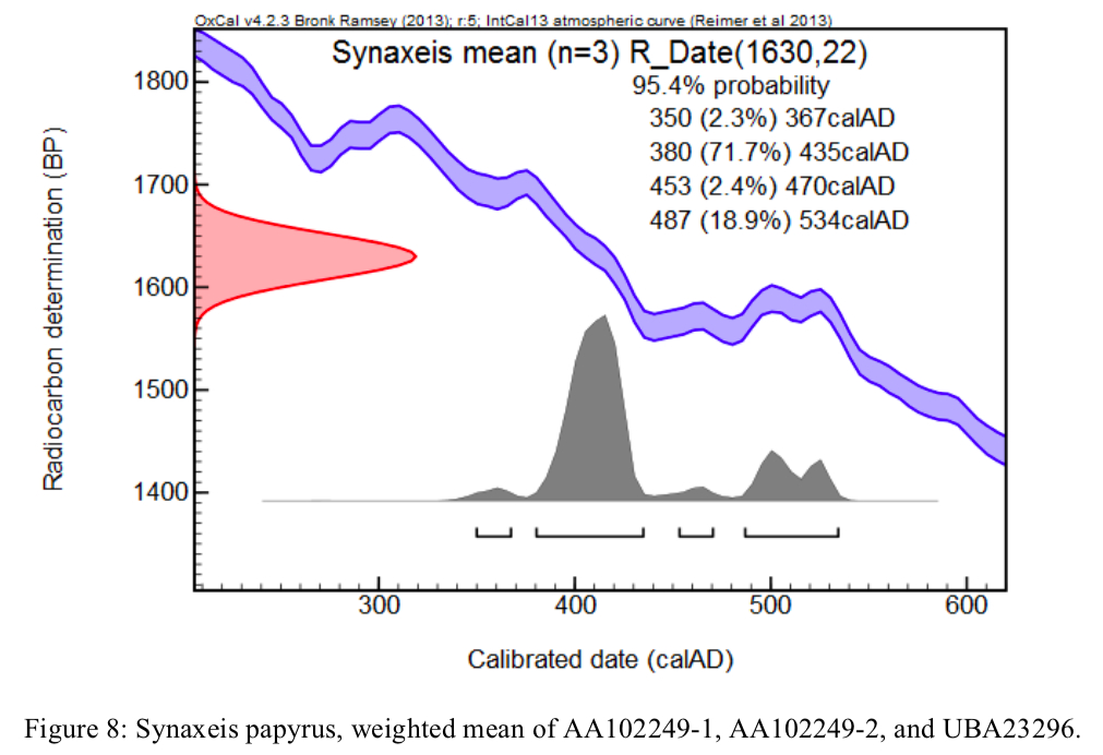 The calendar range is now 405-538 CE (95.4% probability). Using the new calibration curve, then, the possibility of a fourth century date for the papyrus appears diminished. The probability of a date in the first part of the fifth century remains relatively high, but a date in the sixth century is no longer quite so easily excluded.