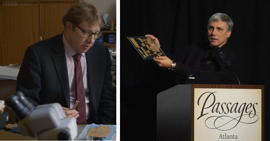 Sampson’s article includes photos from the Christie’s brochure. Among them are images said to document the extraction of the papyrus from cartonnage. Using metadata from the images in the file, Sampson compellingly demonstrates that these photos were staged.