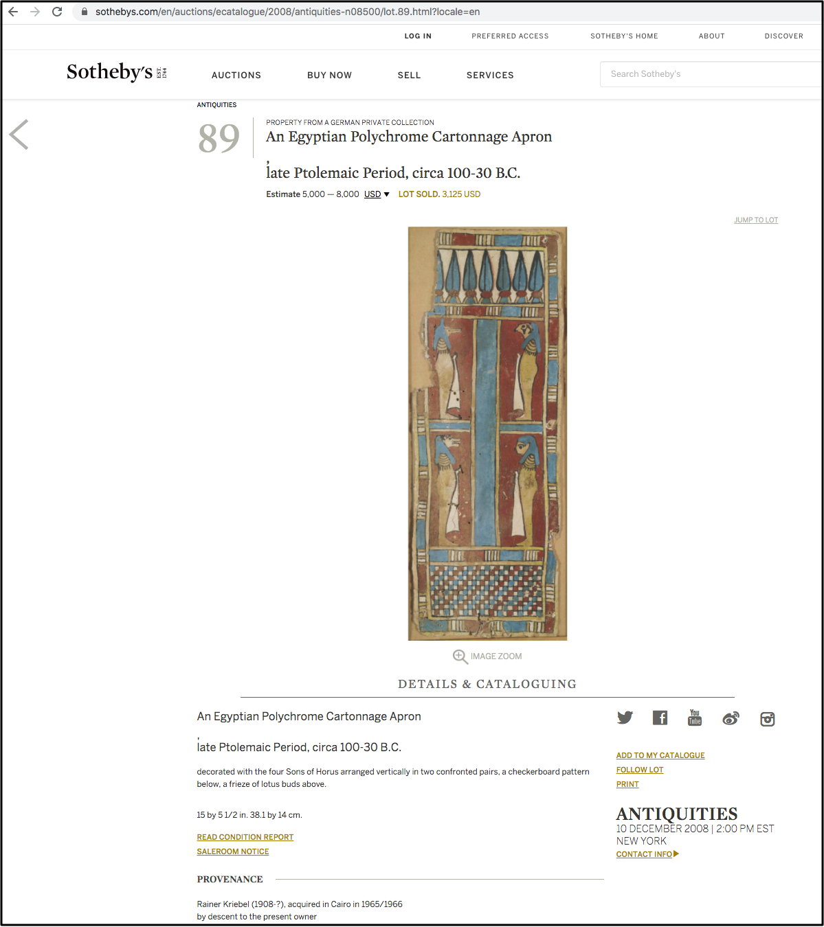 What is new in Sampson’s article is the identification of this Ptolemaic-era cartonnage. With some impressive sleuthing, Sampson was able to identify this panel as (the lower half of) one that was purchased through Sotheby’s in 2008: