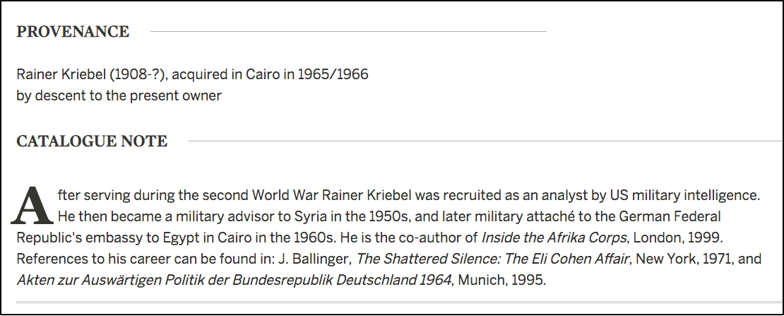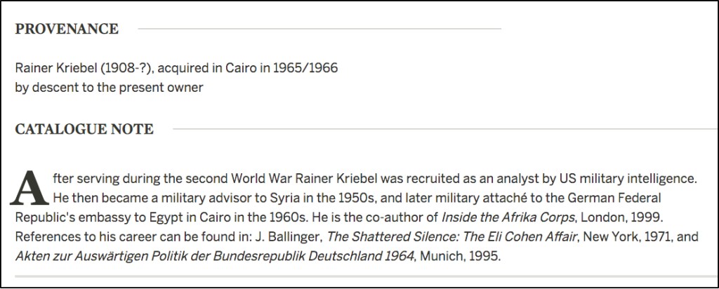 The person listed as the previous owner of the panel was Rainer Kriebel, “military attaché to the German Federal Republic’s embassy to Egypt in Cairo.” It’s hard to believe that there would be two pieces of cartonnage connected to both the Sappho papyrus and a German military official. It seems that Sampson has found our “German officer.”