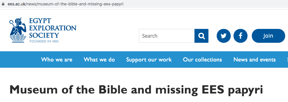 The first announcement by the EES (25 June 2019) noted the possibility that recently published early Christian papyri in the EES collection from Oxyrhynchus were identical to four papyri that were said to have been sold to Hobby Lobby and subsequently donated to the Museum of the Bible. Further investigations revealed that EES materials had indeed been stolen and sold to Hobby Lobby. The next announcement (14 October 2019) identified 13 such fragments. This was followed closely by another announcement (21 October 2019) that 5 additional EES fragments had been stolen and sold to American collector Andrew Stimer. Another announcement (16 November 2019) raised the number of EES items held by Stimer to 6 and noted that an inventory of the EES holdings from Oxyrhynchus “has to date identified around 120 pieces which appear to be missing, almost all from a limited number of folders; it is possible that a few more cases may emerge.”