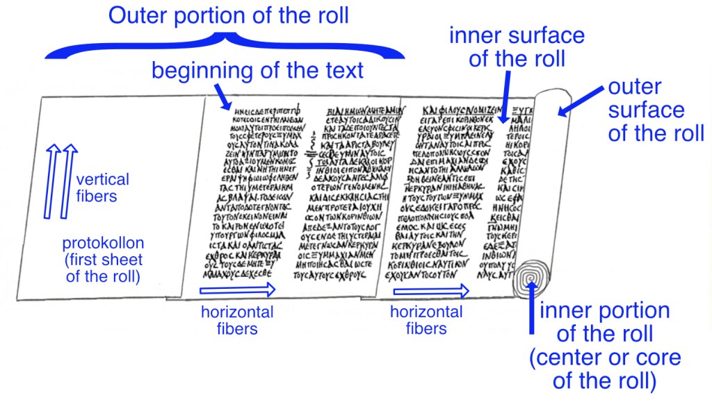 “Normally when a papyrus roll was rolled up, the text was on the inner surface of the roll, and the beginning of the text on the roll was positioned so that it would be the first thing readers encountered when they unrolled it.”