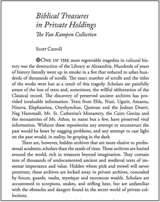 I’ve written before on a few occasions about the Van Kampen Collection of ancient manuscripts, a kind of predecessor of the Green Collection. In fact, it was Scott Carroll, the main architect of the Green Collection, who was also the force behind assembling this collection for the evangelical investment banker Robert Van Kampen in the 1990s.