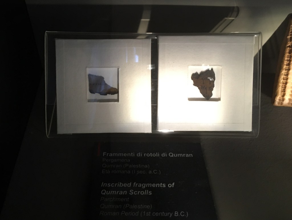 A visit to the Vatican Museums almost always yields something new. You can never know which rooms will be open, so occasionally there is the pleasant surprise of getting to see material that is usually hidden away. There are also times that your eye catches something that is always on display but that, for whatever reason, you have missed before. In this instance, it was a couple items in the Museo Gregoriano Egizio. In a cabinet of miscellaneous near eastern artifacts, and facing away from the intense “flow” of directed traffic in the museum, are two small animal hide fragments inscribed with Hebrew text and framed upside down.