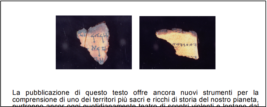 “Ce fragment se trouve depuis quarante ans et plus dans une collection privée, à Rome, où je l’ai examiné récemment. Son existence m’est, néammoins, connue depuis longtemps, grâce à un renseignement du propriétaire précédent, qui l’avait en son temps reçu à Jérusalem, ainsi qu’un deuxième fragment, provenant également de Qumran.”