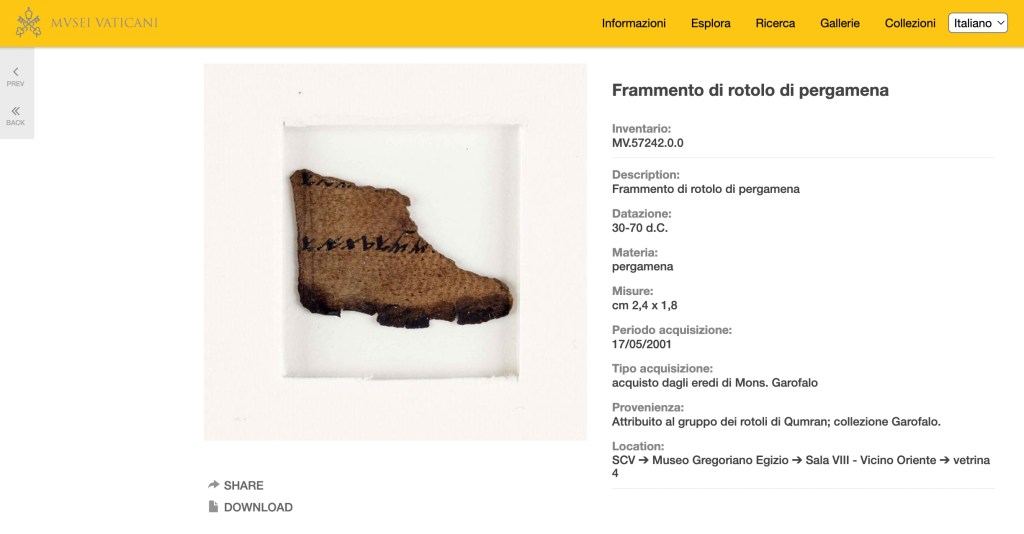 I mentioned in a post in 2021 that the Vatican Museum had on display two small fragments of animal hide with Hebrew letters that are identified as “inscribed fragments of Qumran scrolls.” They were donated in 2001 from the personal collection of Salvatore Garofalo (1911-1998), a priest and theologian. At the time, I could not find any quality digital images of the pieces. I see from some browsing on the excellent online catalog of the Vatican Museum that much better images are indeed available (though, like the display in the Museum, the fragments are upside down):
