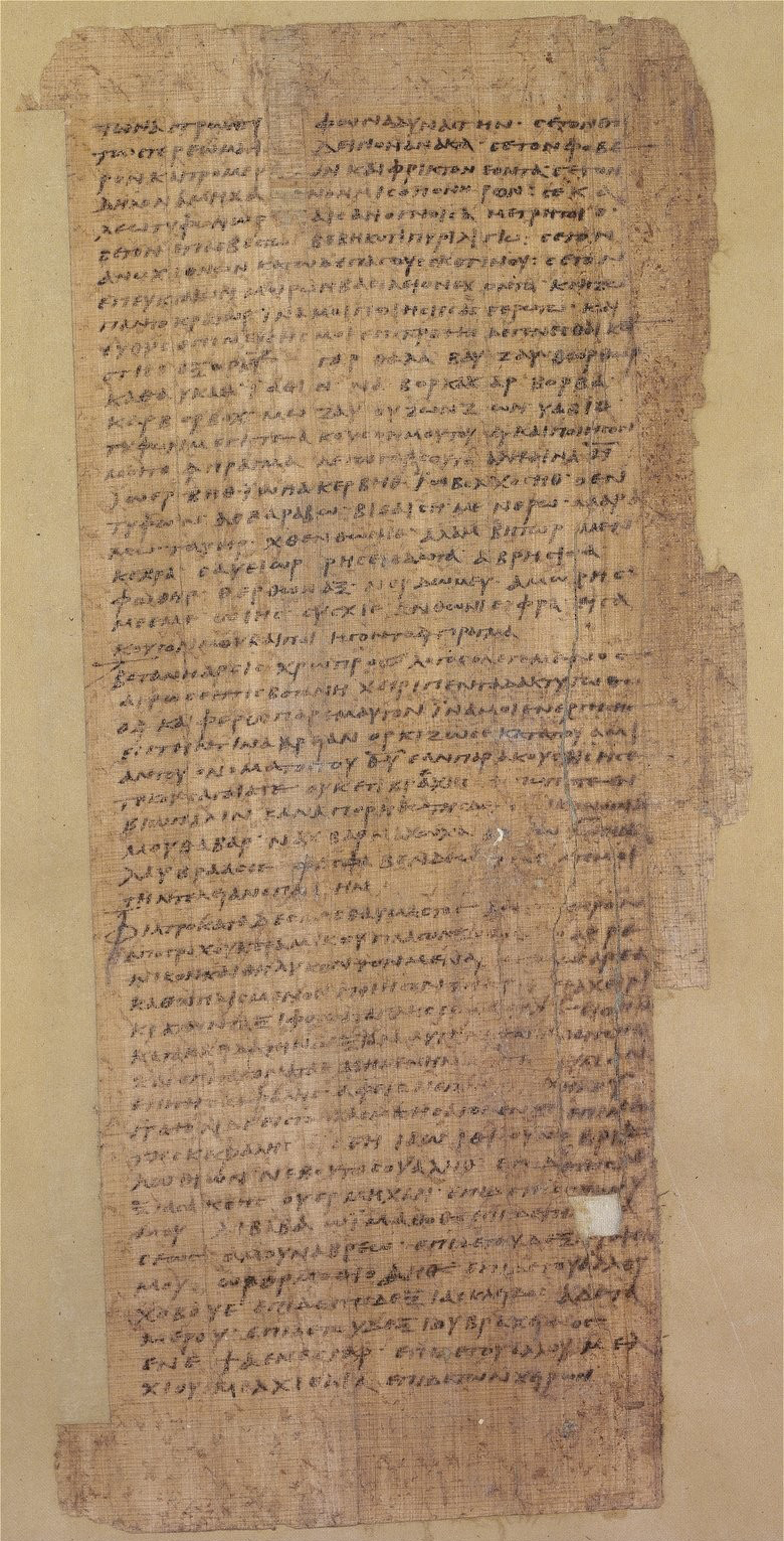 I entrust this binding spell to you chthonic gods (παρακατατίθεμαι ὑμῖν τοῦτον τὸν κατάδεσμον θεο[ῖ]ς καταχθονίοις), Pluto and Kore Persephone Ereschigal and Adonis also called Barbaritha and Hermes chthonian Thoth Phokensepseu Erektathoti Misonktaik and Anoubis the powerful Pseriphtha, who holds the keys of Hades, and to you chthonic divine demons, the boys and girls prematurely dead, the young men and women, year after year, month after month, day after day, hour after hour, night after night; I conjure all the demons (ὁρκίζω πάντας τοὺς δαίμονας) in this place to assist this demon Antinous. Rouse yourself for me and go to each place, to each neighborhood, to each house and bind Ptolemais whom Aias bore, the daughter of Horigenes, so that she should not be fucked, buggered or should not give any pleasure to another man (ὅπως μὴ βινηθῇ μὴ πυγισθῇ μὴδὲν πρὸς ἡδονὴν ποιήσῃ ἑταίρῳ ἀνδρὶ), except to me alone Sarapammon, whom Area bore; and do not let her eat nor drink nor resist nor go out nor find sleep except with me Sarapammon, whom Area bore. I conjure you, Antinous spirit of the dead, in the name of the Terrible and Fearsome, the name at whose sound the earth opens up, the name at whose sound the demons tremble in fear, the name at whose sound rivers and rocks burst asunder. I conjure you, Antinous spirit of the dead (ὁρκίζω σε, νεκύδαιμον Ἀντίνοε), by Barbaratham Cheloumbra Barouch Adonai and by Abrasax and by lao Pakeptoth Pakebraoth Sabarbaphaei and by Marmaraouoth and by Marmarachtha Mamazagar. Do not disregard me, Antinous spirit of the dead, but rouse yourself for me and go to each place, to each neighbourhood, to each house and bring me Ptolemais, whom Aias bore, the daughter of Horigenes; prevent her from eating, from drinking, until she comes to me, Sarapammon, whom Area bore, and do not allow her to accept the advances of any man other than me alone Sarapammon. Drag her by the hair, the guts, until she does not reject me, Sarapammon, whom Area bore, and I have her, Ptolemais, whom Aias bore, the daughter of Horigenes, subject to me for the entire extent of my life, loving me, desiring me, telling me what she thinks. If you do this, I will release you (ἀπολύσω σε).