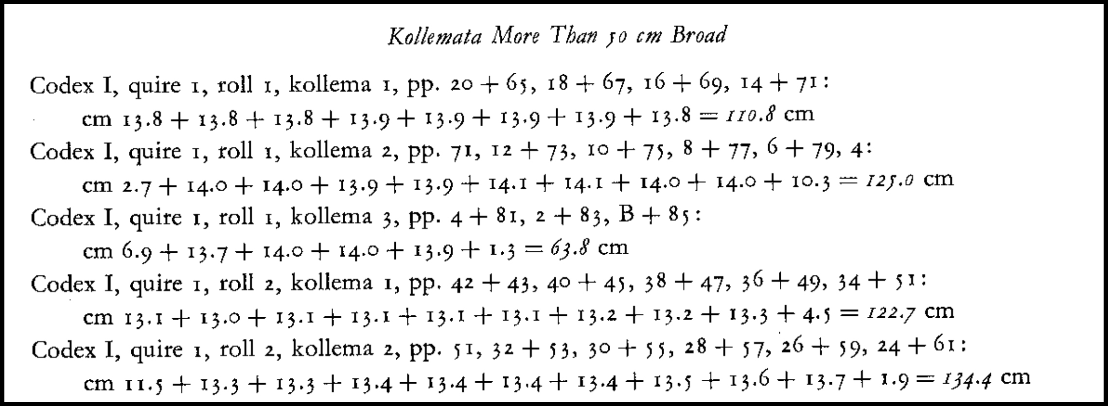 Measurements of the kollēmata that make up the rolls of the first quire of Nag Hammadi Codex I from Robinson’s introduction to The Facsimile Edition of the Nag Hammadi Codices, page 67