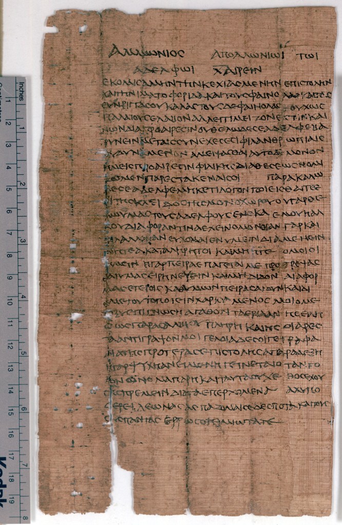 I recently came across the reference in Theodor Birt that reminded me of an old problem. After a description of the production of papyrus sheets, Birt states that “the resulting sheets were sold individually (Die so entstandenen Blätter kamen einzeln zum Verkauf)” (Birt, Die Buchrolle in der Kunst, 1907, p. 6). The common view now is that the unit of sale for papyrus was the roll and not the individual sheet. The fact that we find kollēseis (the overlap where sheets are joined together) in the bifolia used to make up papyrus codices would seem to be decisive evidence that papyrus was purchased in rolls rather than individual sheets, at least in the Roman period. In some cases, we can even reconstruct the rolls from which the bifolia of papyrus codices were cut (scroll down at the link here). And we also find kollēseis in documentary letters, which suggests that these too were cut from rolls. P.Oxy. 42 3057 is a nice example of this phenomenon. It’s a letter (likely of the first or second century CE) with a prominent kollēsis running down the right side of the papyrus.