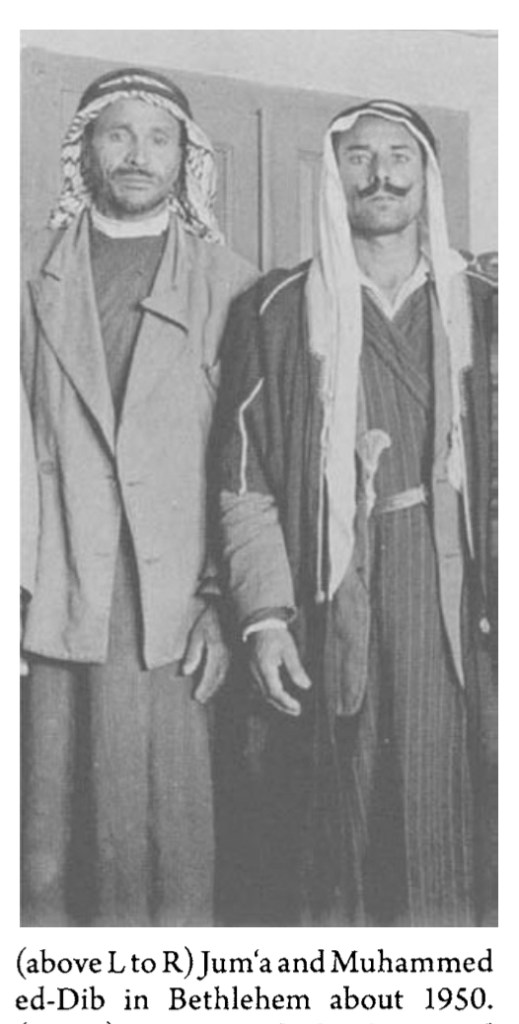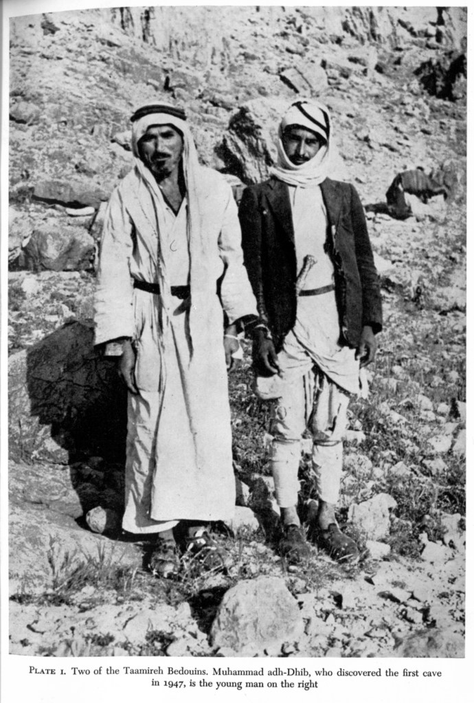 “….I had carried along Burrow’s book containing a photograph of “Muhammad ed-Dib [sic, slightly-different spelling than in Burrows’ caption] and another Bedouin standing together near what looks like Cave 1 in the background. With no warning to Abu Daoud, who was sitting in front of me, I thrust the photograph in front of him. Without even a second’s hesitation, his face lit up, he pointed at the person identified as “ed-Dib,” and then pointed at himself, and excited [sic], and repeatedly said it was he. He then identified the other as “Jum’a,” his “cousin.” Abu Daoud was illiterate, even in Arabic, so he couldn’t have read the English caption….”