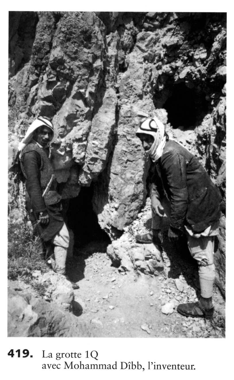 This picture was taken in 1951 by Richmond Brown, and published (I think) for the first time in this 1953 Picture Post article. This picture is part of the photo archive of the École biblique et archéologique française de Jérusalem. The Picture Post simply calls the men in the picture “two shepherds.” In the photographic catalog of the École biblique, one of the men is identified as the person who is said to have first discovered the cave, Muhammad ed Dhib: