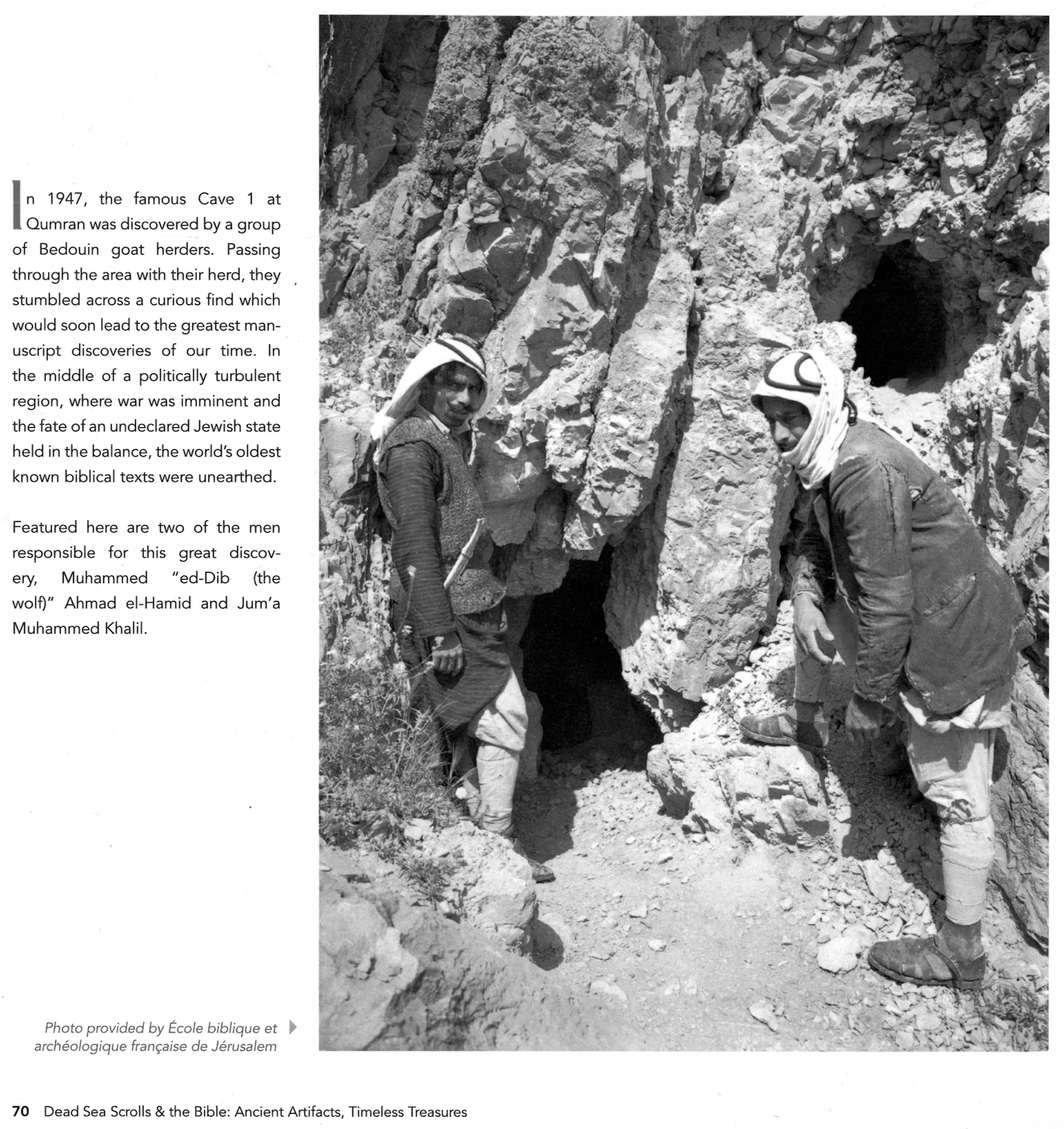Alongside the photo is the description, “Featured here are two of the men responsible for this great discovery, Muhammed ‘ed-Dib (the wolf)’ Ahmad el-Hamid and Jum’a Muhammed Khalil.” Another name is added, but it’s not clear which person is which. I do not know where the anonymous author found this extra information, and I cannot confirm or disconfirm its accuracy.