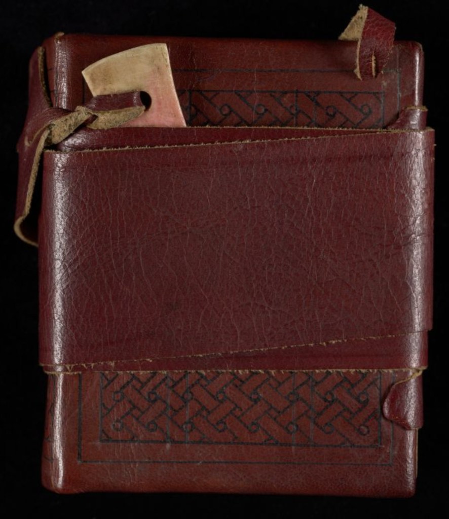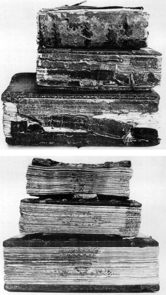 These three books are now in the Chester Beatty collection in Dublin (Cpt 813, Cpt 814, and Cpt 815) and were bought from the Cairo dealer Maurice Nahman (other books from the same find are in the University of Michigan’s collections). The codices were considerably fancier than they look in these photos. The leather on the covers had intricate decorations, and the books were found together with the remains of elaborate leather wrapping bands and carved bone clasps. The article in which these photos appeared was written by Charles T. Lamacraft,1 who also produced some lovely models of the codices based on his study of the surviving fragments: