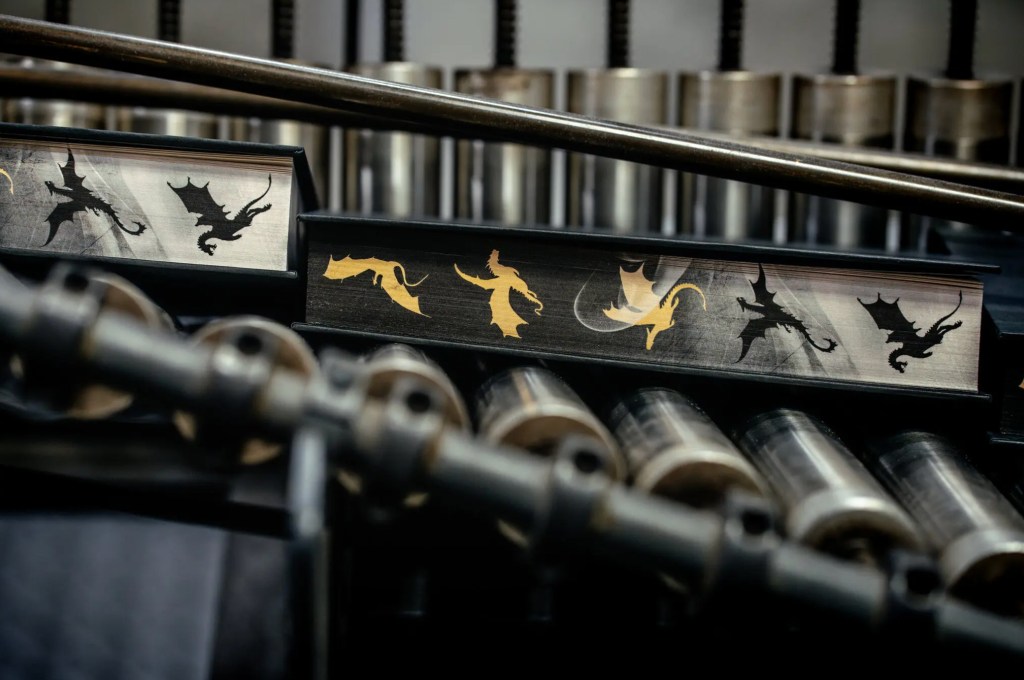 There is a fun article in The New York Times about the growing trend among publishers of producing deluxe editions of romance and fantasy books. The article mentions different kinds of cover enhancements but focuses on decoration of the fore-edge. There are short videos and photos of the production of the deluxe edition of Rebecca Yarros’s Onyx Storm, which is due out in January 2025. The deluxe edition will have dragons painted on the fore-edge: