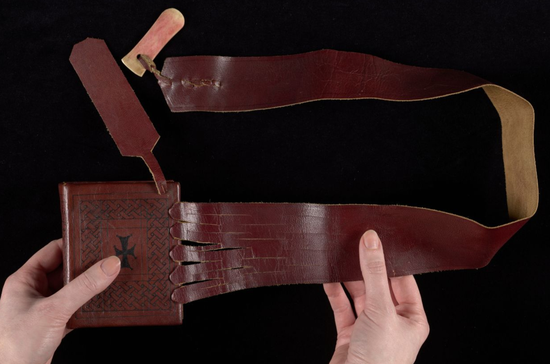 These three books are now in the Chester Beatty collection in Dublin (Cpt 813, Cpt 814, and Cpt 815) and were bought from the Cairo dealer Maurice Nahman (other books from the same find are in the University of Michigan’s collections). The codices were considerably fancier than they look in these photos. The leather on the covers had intricate decorations, and the books were found together with the remains of elaborate leather wrapping bands and carved bone clasps. The article in which these photos appeared was written by Charles T. Lamacraft,1 who also produced some lovely models of the codices based on his study of the surviving fragments: