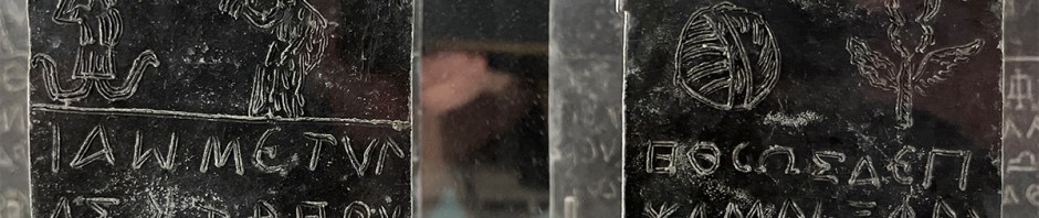 It was Montfaucon who gave this small genre its commonly used name (“Basilidian books”), because of the iconography, which includes an Abraxas figure (a human torso and arms with a bird head and two serpents in place of legs), which he associated with the “gnostic” teacher Basilides. Montfaucon said that he gave this lead book to Cardinal de Bouillon (1643-1715). I am not aware of its current location.