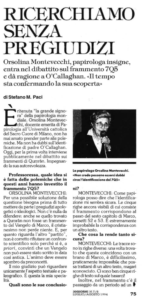 This article, which is the source of Thiede’s quotation endorsing the identification 7Q5, actually has an extended interview with Montevecchi, in which she outlines her reasoning for accepting the identification. It’s fascinating to see what she actually says.