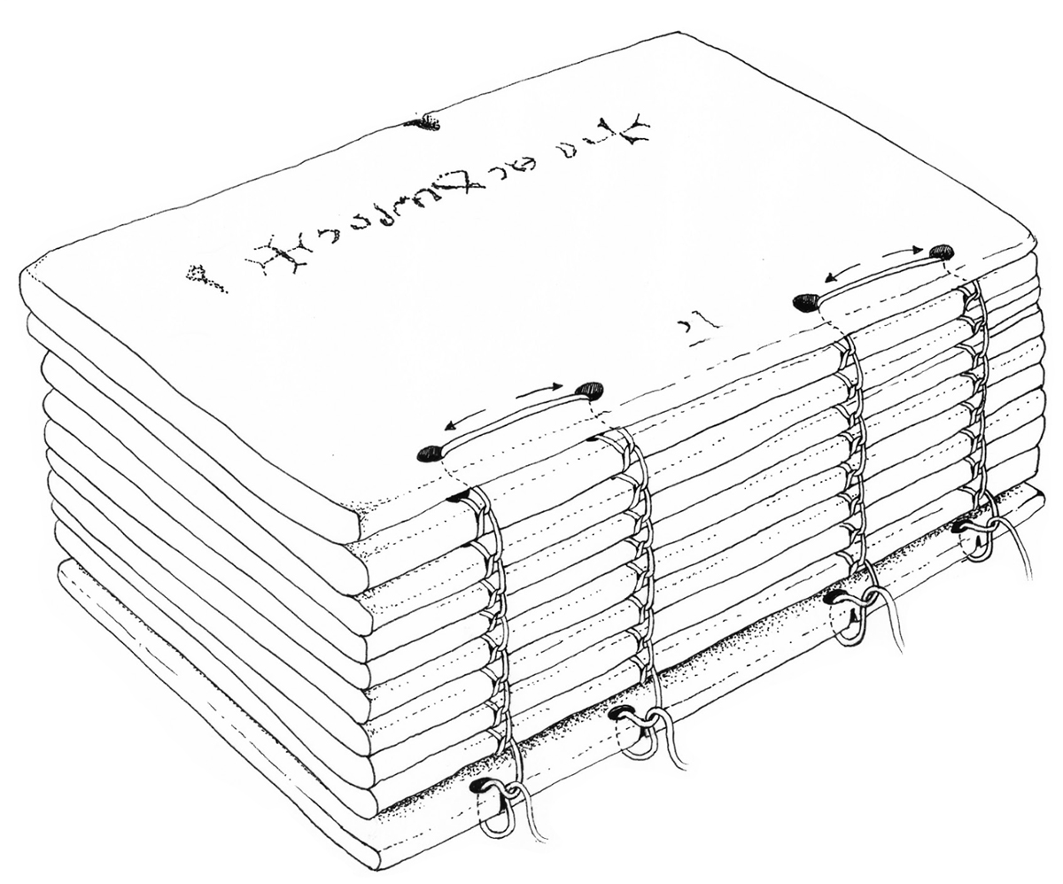 Boudalis’s reconstruction of possible method for sewing tablets together; image source: G. Boudalis, The Codex and Crafts in Late Antiquity (New York, 2018), p. 29, fig. 15