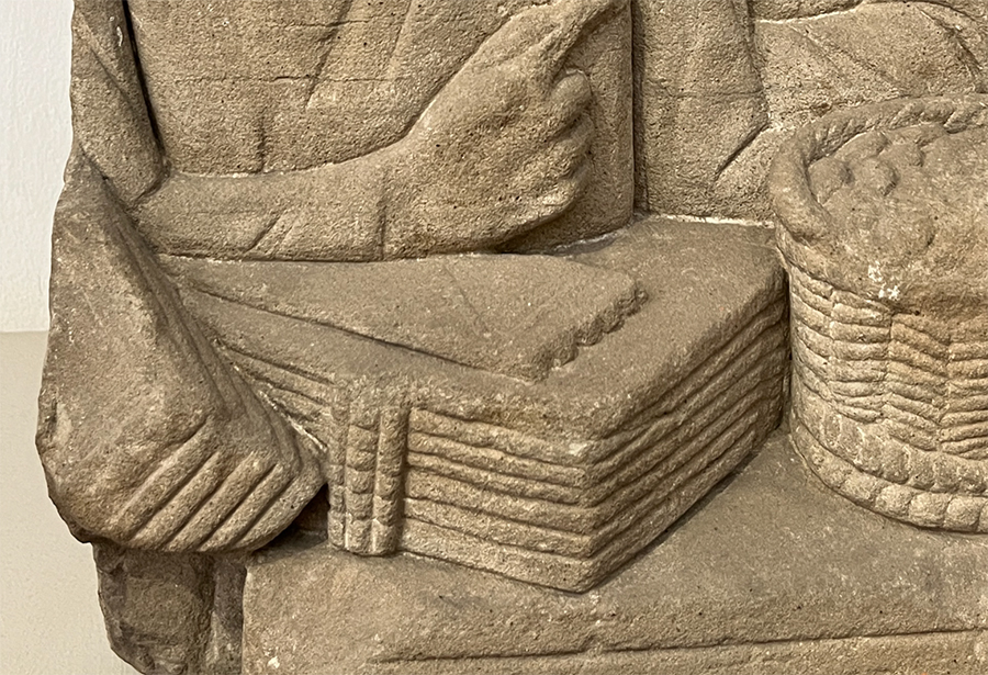 The figure at far left has a set of tablets that appear to be sitting spine-side-out, and it looks like the person who carved the relief has attempted to represent the stitching of the tablets: