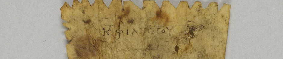 The book from which it was poached must have been a very nicely produced codex. The script is a Biblical Majuscule with an appealingly light touch. The script is typically assigned to the fourth century, although the fifth century also seems possible to me. But I’m most curious about the afterlife: What was the intended use of this little item? It seems pretty clear that it was deliberately cut from a folium. But why the notches? Was it a book mark? Some kind of decorative item? It’s a fascinating piece.