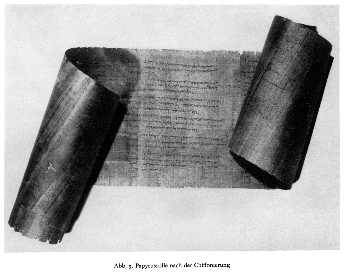 Today I stumbled across a very interesting article that describes the process of conserving these rolls–“die Methode der doppelseitigen Chiffonierung,” double-sided application of a fine silk to hold the roll together, a practice championed by Rolf Ibscher (1906-1967), book conservator and son of the famous conservator, Hugo Ibscher (1874-1943) The roll described in the article is P.Berol. inv. 11651 (the one in the black and white image above), and the same process was applied to 11642, the roll in the color image above. The process has several steps.