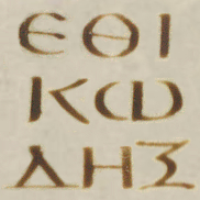 In this early portion of Matthew (on the left), both the section number and the canon number are accompanied by a supralinear stroke. The numbers are also noticeably smaller than the letters in the main text. In the example from John (right), only the section number has such a stroke, and two of the three letters are roughly the same size as the letters in the column. Note the distinctive forms of mu in the section numbers. The example on the left (Matthew) is similar to the “Biblical Majuscule” of the main text. The example of mu on the right (John) with its low medial dip and curved flourishes on the vertical strokes, presents a very different look from the mu of the main text.