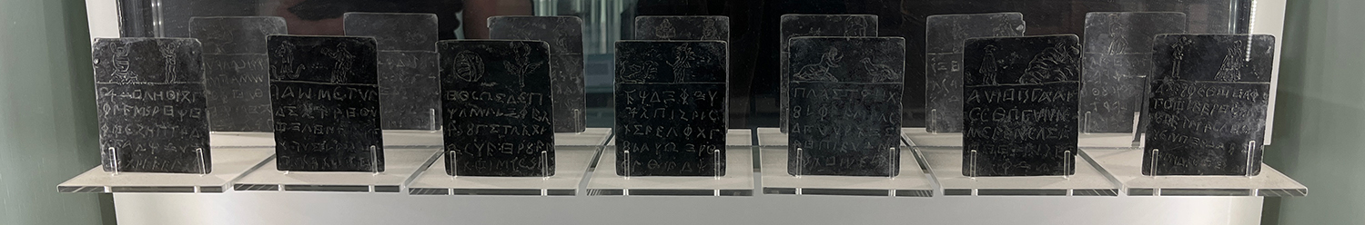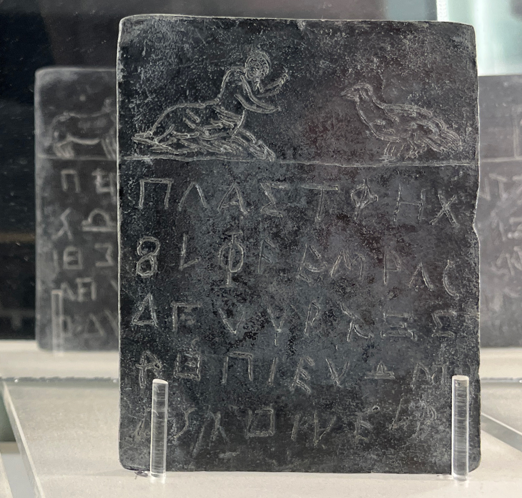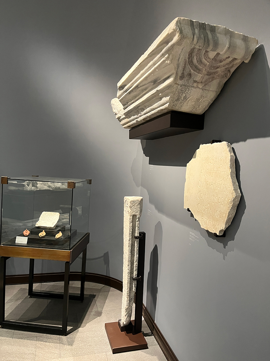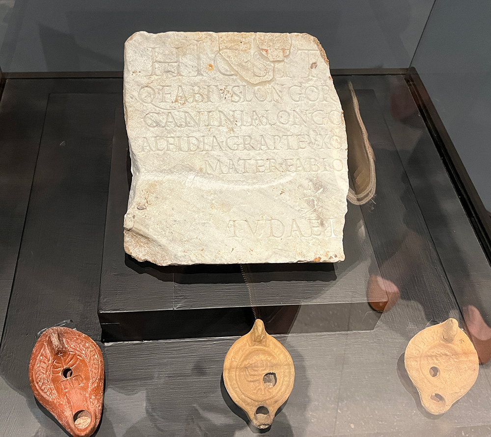 The other item in the display case is described as an inscription of the first century CE. It may in fact be that old, but not necessarily. This is another relatively recently discovered piece of evidence for Jews at Ostia. The inscription was discovered by chance during construction work in 2006 in the Pianabella area southeast of Ostia. It identifies several people as Judaeans (Iudaei), including a certain Quintus Fabius Longor[um]. A Quintus Fabius Longus is known from the Fasti Ostiensis as a duovir and prefect in the 30s CE. The form of the name in the inscription, Longor[um], may indicate that we are dealing here with a freed person of the Fabii Longi, either in the first century or later.