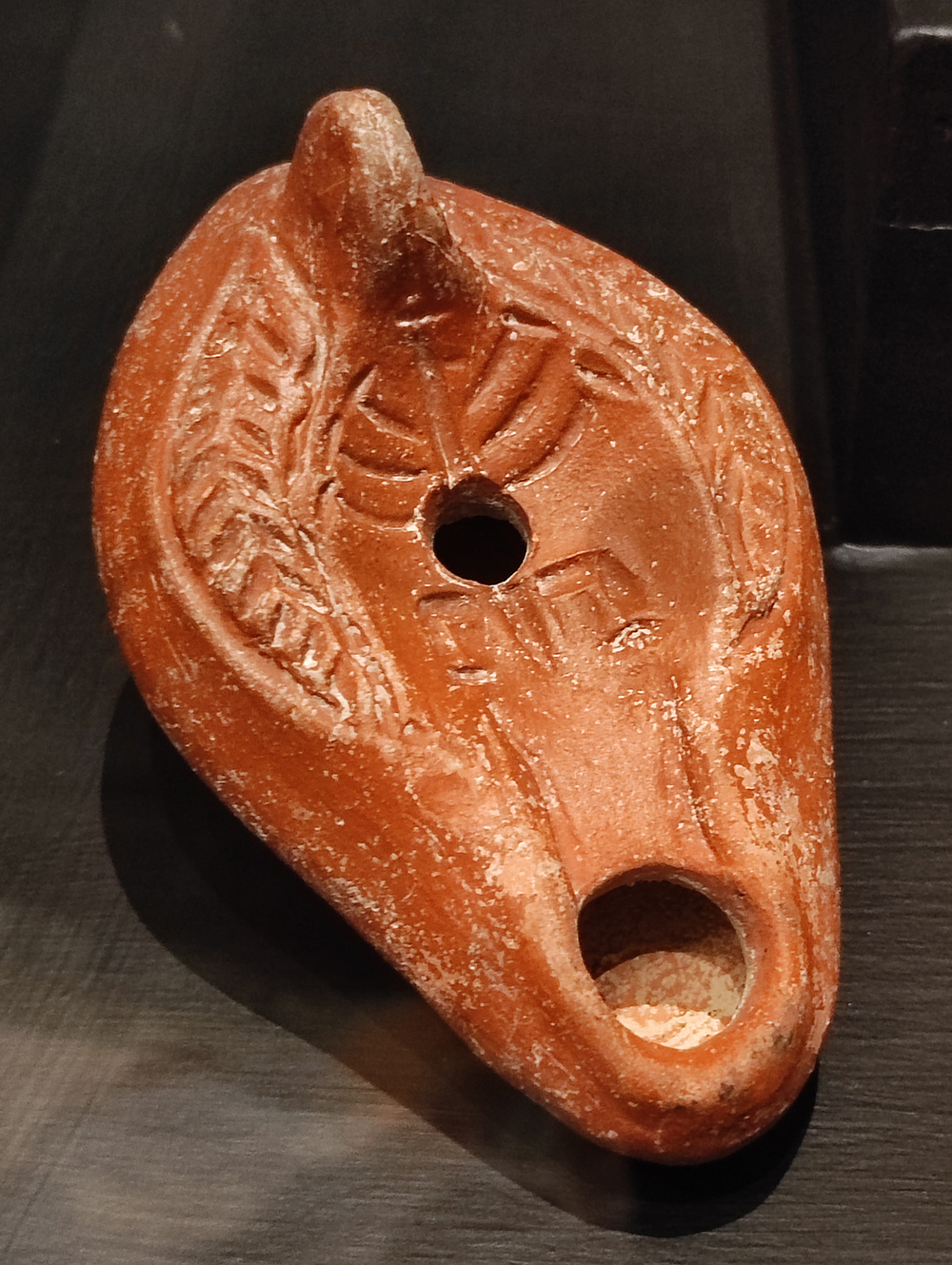 On a related point, back in August of 2024, I noted that the site museum at Ostia had reopened after a long closure. I also expressed some disappointment that none of the many Jewish artifacts from the site were on display. This has now been partially remedied with a small case containing the recently excavated menorah lamp along with two other decorated lamps. I say “partially” because the display contains almost no didactic material, and what little there is seems wrong. The display label does not say where the lamps were found and gives a date of “II-V secolo” for the whole group. Yet, we do know where the other two lamps (inv. 12495 and 12498) were found. They come from the synagogue excavations of the 1960s. They were found above a floor that post-dates the mid-fourth century and have been assigned by Letizia Ceccarelli to the latter part of the fourth century or the fifth century. I’m not aware of any lamps that exactly match the decoration of the lamp from the mikveh, but similarly shaped African lamps with a central decoration flanked by stylized palm leaves are also assigned to the fourth and fifth centuries.